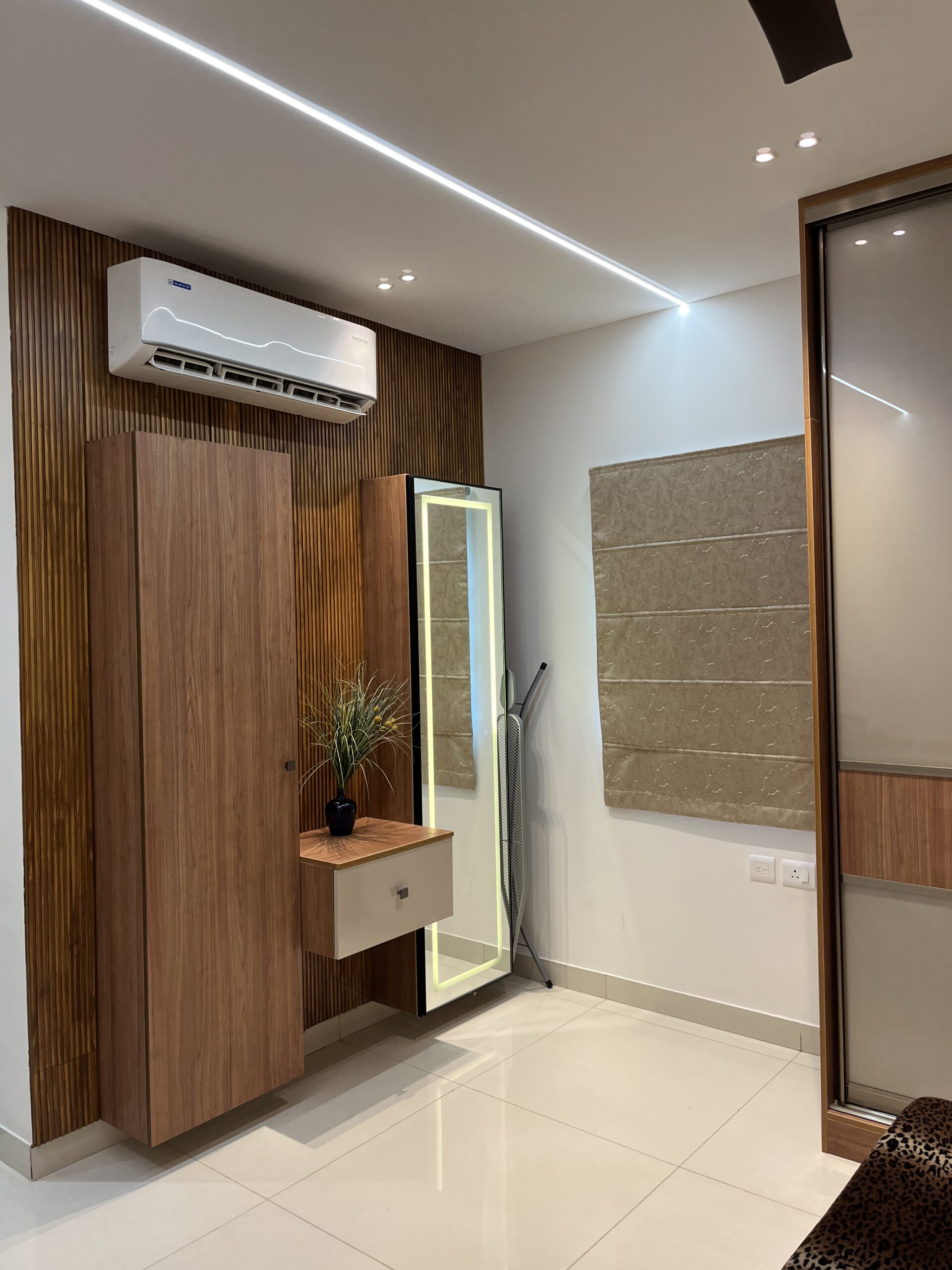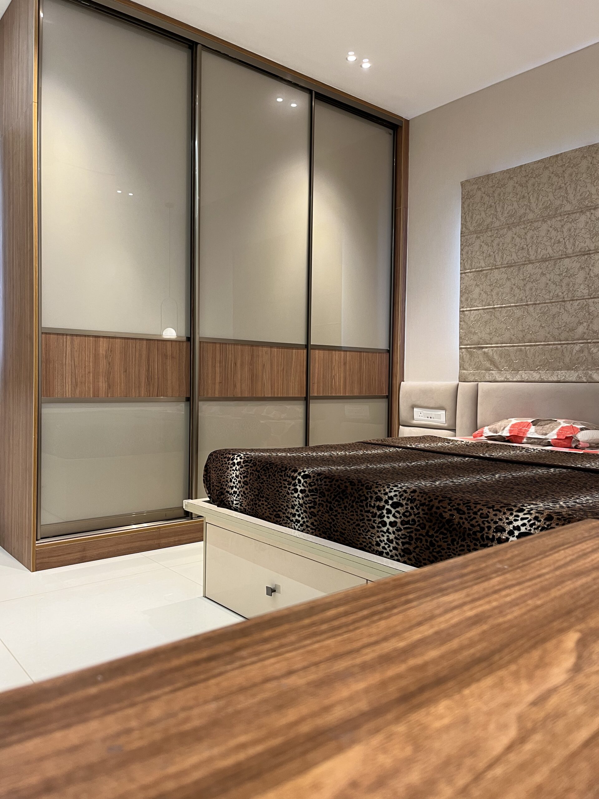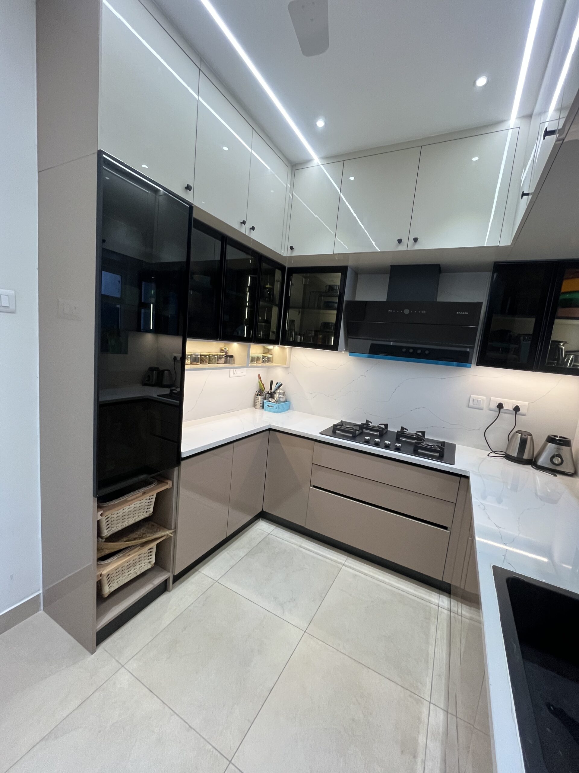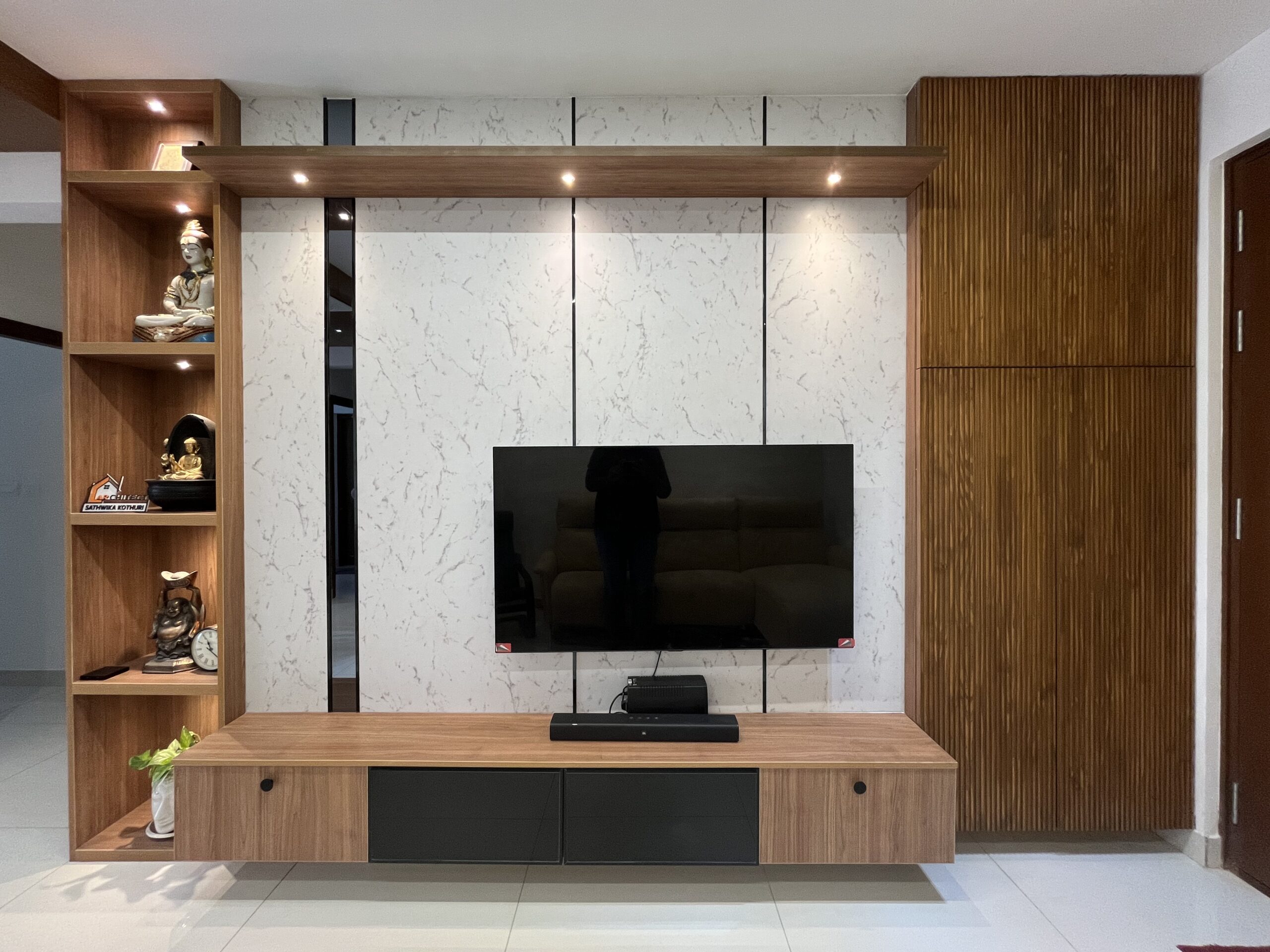 This project included complete home interiors such as a modular kitchen, custom wardrobes, TV unit design, false ceiling, and decorative lighting. Every space was carefully planned to maximize storage while maintaining a clean and elegant design. The interiors feature modern finishes, durable materials, and thoughtfully designed layouts suitable for comfortable apartment living.
